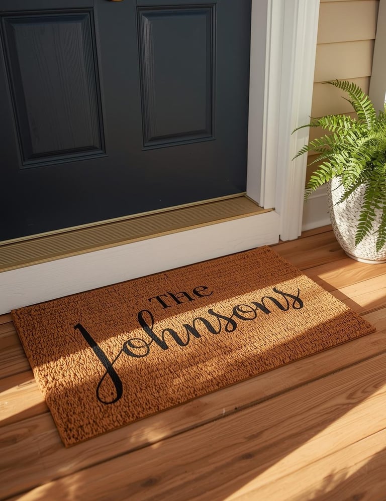 For doormats, you can get custom options with their family name, a monogram, their house number, or even a fun saying that reflects their personality. Natural coir doormats are classic and durable, rubber mats work great for covered porches, and there are even indoor mats that are softer underfoot. The key is choosing something that matches their style—traditional monograms for classic homes, funny sayings for more casual vibes, or simple house numbers for modern aesthetics.
