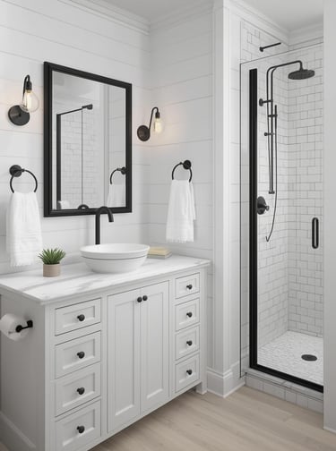 Make a bold statement with black matte fixtures that bring sophisticated edge and modern drama to any bathroom. The deep contrast against white or neutral backgrounds creates instant visual impact—think faucets, showerheads, towel bars, and cabinet hardware all in sleek matte black. This trend works beautifully mixed with other finishes like brass or stainless for collected appeal. Maintenance tip: matte black hides water spots better than polished chrome, making it surprisingly practical. Contemporary, modern farmhouse, and industrial bathrooms absolutely thrive with this moody, refined aesthetic that's anything but boring.