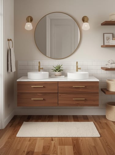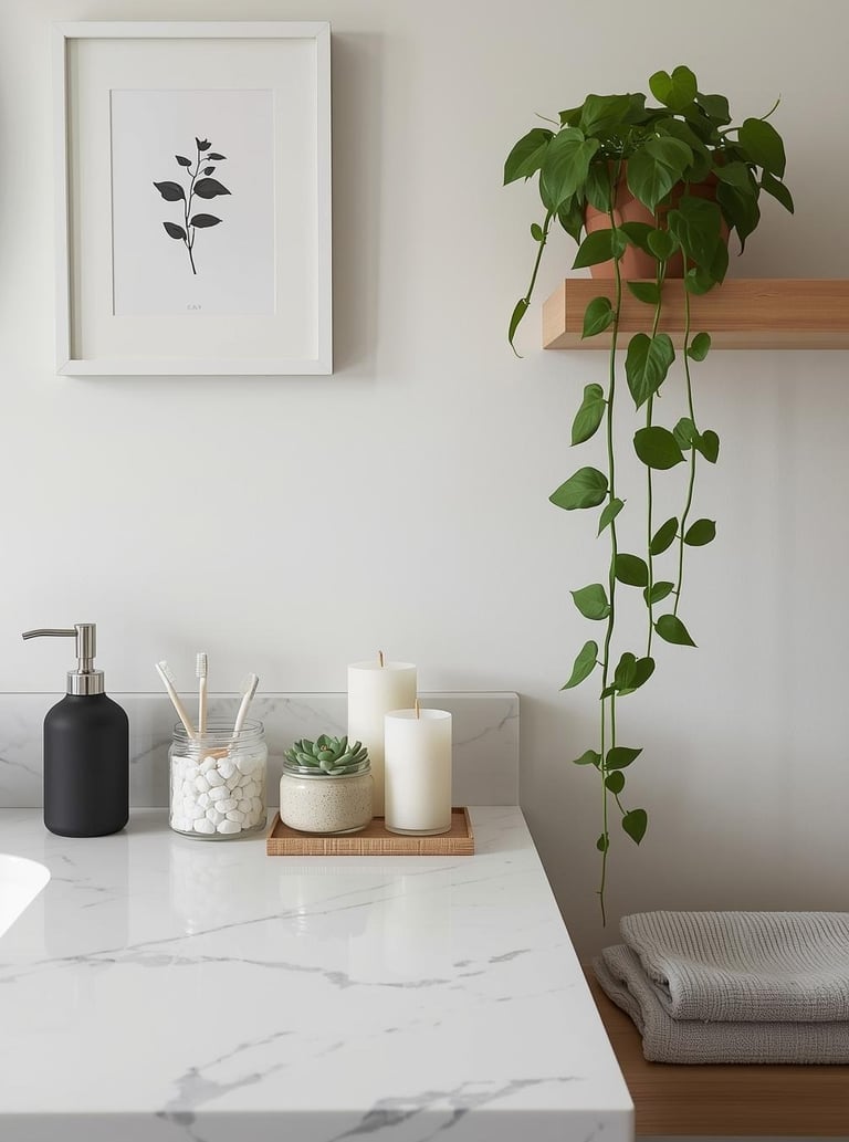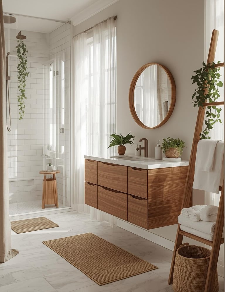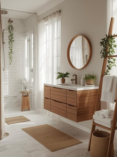 Transform your bathroom into a serene escape by bringing nature inside. Add warmth with teak bath mats and wooden floating shelves, then layer in stone or marble accents for that luxury hotel vibe. Style natural fiber baskets for chic storage that actually looks good. Don't forget live plants—eucalyptus hung in your shower, trailing pothos on shelves, or low-maintenance snake plants add life and purify air. Finish with bamboo accessories and organizers for organic texture throughout. Primary bathrooms and zen-inspired spaces absolutely thrive with this calming, nature-forward approach.