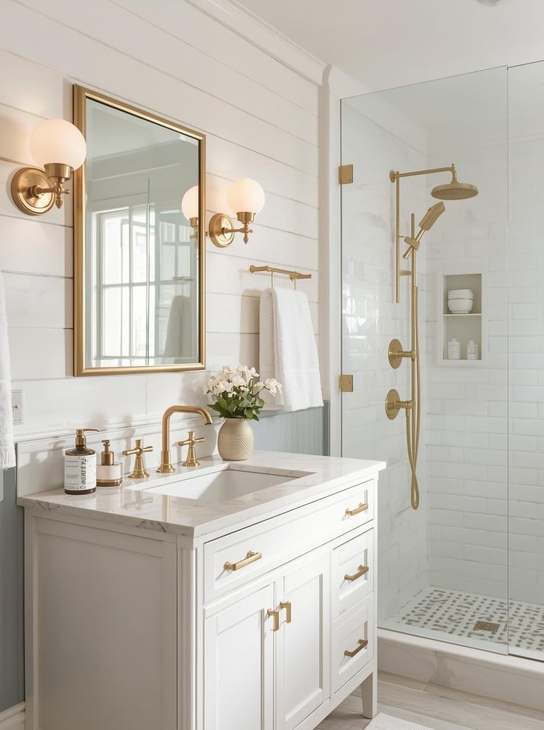 Ditch the cold chrome and embrace the warm sophistication of brass and gold fixtures that instantly elevate your bathroom's vibe. Swap out faucets, towel bars, cabinet hardware, and showerheads for warm metals that add luxe appeal without the luxury price tag. Mix brushed and polished finishes for that collected-over-time look, and don't forget coordinating light fixtures to tie everything together. The beauty of warm metals? They work across styles—modern, transitional, vintage-inspired—and age beautifully with natural patina. This simple fixture upgrade delivers maximum impact for relatively minimal investment.