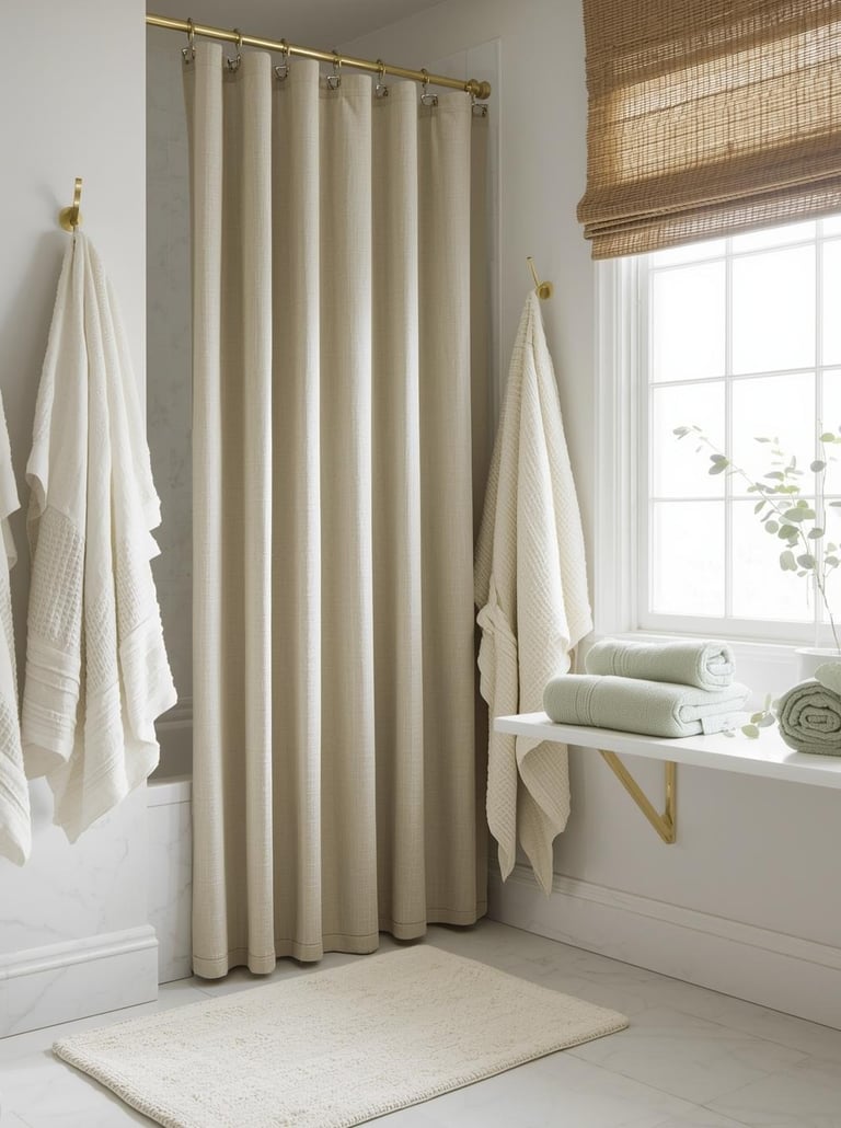 Transform your bathroom into a five-star hotel experience by investing in textiles that feel as good as they look. Upgrade to plush oversized bath mats that cushion your feet, thick Turkish cotton towels in spa-worthy weight, and textured shower curtains that add dimension beyond basic plastic. Don't forget window treatments—linen or bamboo shades provide privacy while keeping things light and airy. Coordinate colors across all textiles for cohesive polish or mix complementary tones for collected charm. This works across every bathroom style, especially spa-inspired spaces craving that luxurious, wrapped-in-comfort vibe.