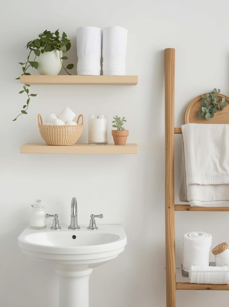 Stop wasting valuable wall space and go vertical with open shelving that's functional eye candy. Install floating wood shelves for displaying rolled towels, plants, and candles, or lean a ladder shelf against the wall for instant storage that doesn't require drilling. The styling secret? Keep it edited—beautifully folded linens, small potted greenery, decorative containers, and just enough personality without descending into clutter chaos. Choose materials that match your vibe: natural wood for warmth, sleek metal for industrial edge, or glass for airy minimalism. Small bathrooms and minimalist spaces love this practical-meets-pretty solution.