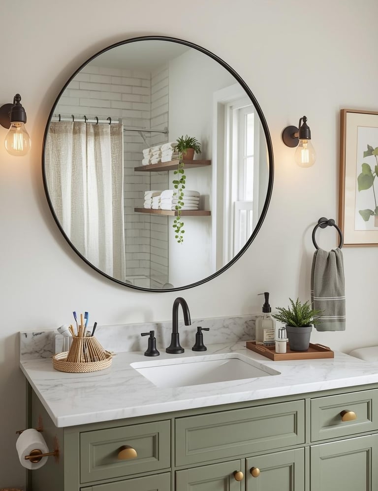 Amplify light and visually expand your bathroom with oversized mirrors that work serious design magic. Go frameless for seamless modern appeal, add frames for traditional elegance, or choose backlit options for spa-worthy ambiance and flattering illumination. Round mirrors soften angular spaces while rectangular designs complement traditional vanities perfectly. Position strategically to reflect windows and maximize natural light throughout your space. The larger the mirror, the bigger your bathroom feels—it's the easiest optical illusion in design. Small bathrooms desperately need this trick, while modern and traditional styles both benefit from this light-reflecting, space-expanding essential.