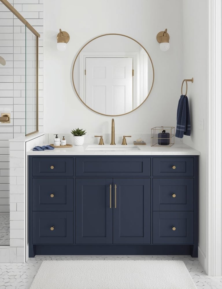 Break free from boring white and wood tones by painting your vanity in colors that actually express your personality. Navy blue delivers timeless sophistication, sage green brings organic calm, charcoal adds moody drama, and blush pink offers unexpected softness. Try two-tone treatments—dark base with contrasting drawers—for extra visual interest. Coordinate your vanity color with walls, tiles, and accessories for cohesive flow or let it stand alone as your statement piece. DIY painters can tackle this weekend project or hire pros for flawless finish. Modern farmhouse and transitional styles especially love this personalized, color-forward approach.