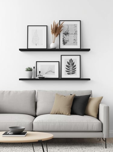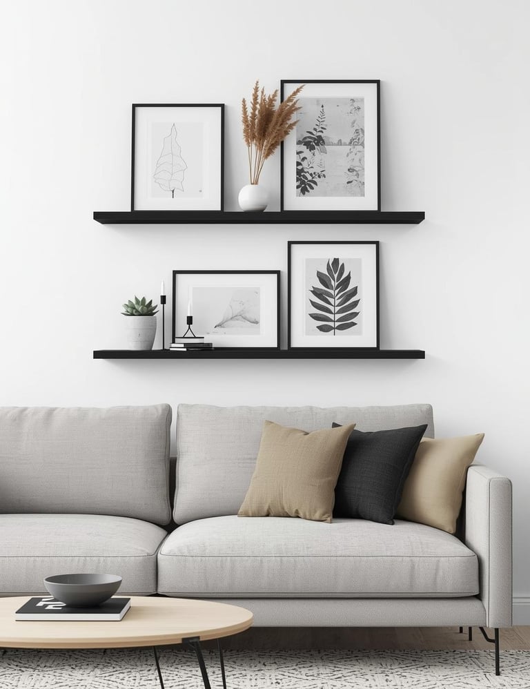 Combine the best of both worlds by pairing mounted shelving with leaning artwork for a dynamic, changeable display that never gets boring. Install one or two deep picture ledges above your sofa, then layer framed prints, small canvases, and decorative objects for a curated gallery feel you can refresh on a whim. The beauty here? Switch out artwork seasonally, rotate favorite pieces, or add new finds without hammering new holes. Style with small plants, candlesticks, or sculptural pieces between frames for dimensional interest. Modern, Scandinavian, and minimalist spaces love this flexible approach—it's clean-lined sophistication with the freedom to evolve as your taste does.