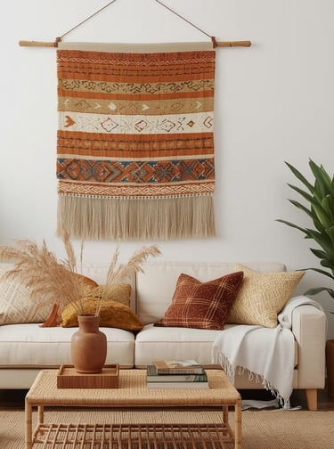 Add instant warmth and texture with a tapestry or woven wall hanging that brings softness to your space. Unlike hard art pieces, textiles create cozy, tactile appeal—perfect for making minimalist rooms feel more inviting or adding global-inspired character to eclectic spaces. Choose from macramé for bohemian vibes, vintage kilim rugs for collected charm, or modern woven pieces for Scandinavian simplicity. The beauty of textiles? They absorb sound, add dimension, and introduce pattern without overwhelming your room. Hang your piece on a decorative rod or wooden dowel for an elevated look. This approach works beautifully in boho, eclectic, and even minimalist spaces craving that perfectly imperfect, handcrafted touch.