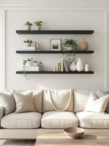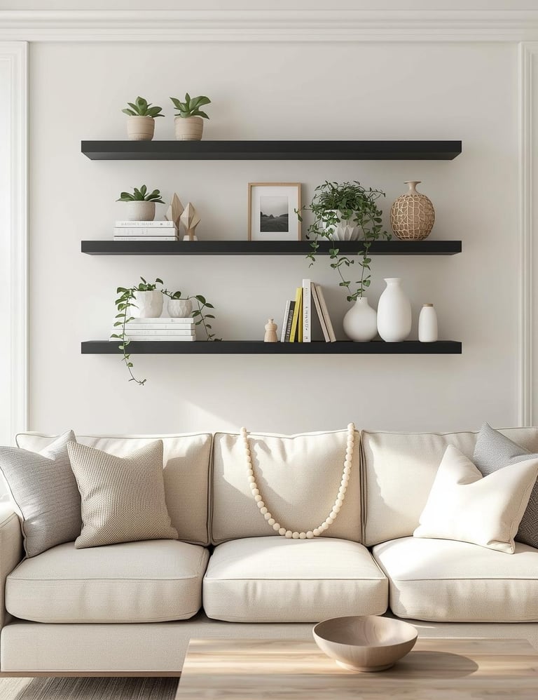 Floating shelves give you the best of both worlds—functional storage that doubles as serious style. Install two or three staggered shelves above your sofa and style them with your favorite finds: stacked coffee table books, trailing potted plants, framed photos, small sculptures, and decorative objects that spark joy. The beauty here is versatility—switch up your display whenever the mood strikes without committing to permanent art. Keep it balanced by mixing heights and textures, and don't overcrowd each shelf. Modern farmhouse and Scandinavian spaces love this look for its clean lines and livable vibe. It's practical decor that actually earns its keep.