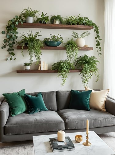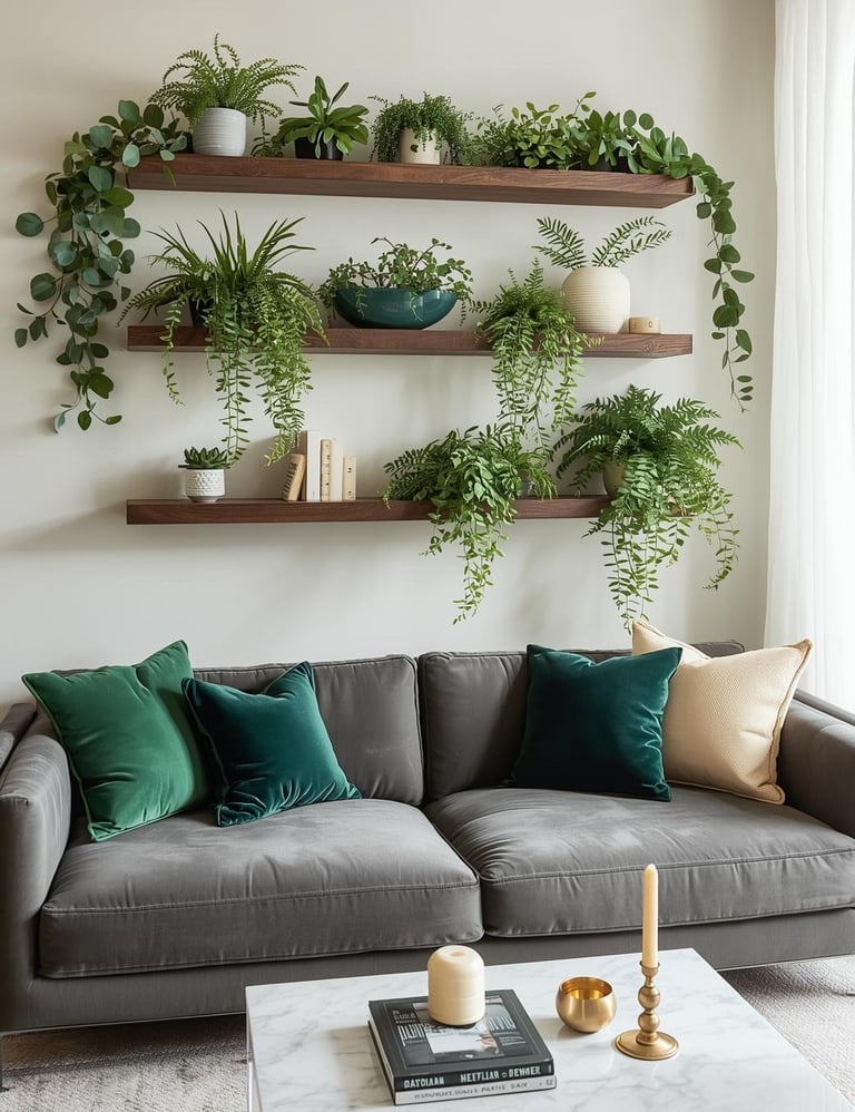 Bring the outdoors in with a living plant wall that transforms your sofa space into a fresh, organic oasis. Vertical planters with cascading pothos, ferns, or succulents create a stunning biophilic moment that purifies air while looking absolutely Instagram-worthy. Not blessed with a green thumb? High-quality faux plant walls have come so far—they deliver the lush, botanical vibe without the maintenance stress. Install modular wall planters, hanging pocket systems, or a dramatic vertical garden frame for maximum impact. This nature-inspired approach works beautifully in modern spaces craving life and movement. Your living room becomes a serene retreat that feels connected to nature, no backyard required.