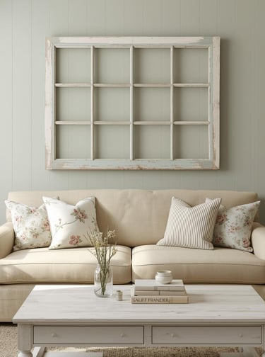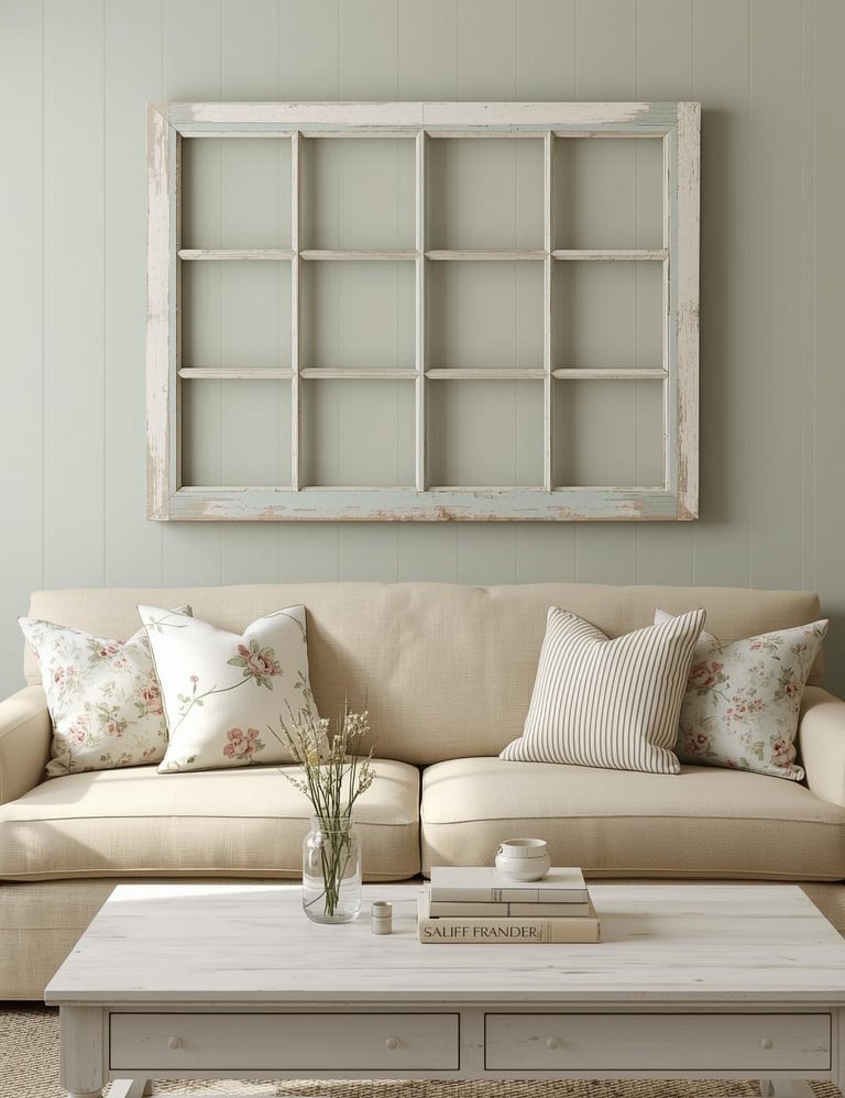 Reclaimed vintage window frames bring instant character and architectural charm that new decor simply can't replicate. Hunt for weathered wooden frames at flea markets, estate sales, or salvage yards—the chippy paint and authentic patina tell stories that make your space feel collected and unique. Hang a single oversized window for dramatic impact or arrange multiple frames in a casual grid for farmhouse gallery vibes. Leave the glass intact for reflection and dimension, or remove it for a lighter look. This rustic approach works magic in farmhouse, shabby chic, and cottage spaces craving that perfectly imperfect, lived-in character that only genuine vintage pieces deliver.