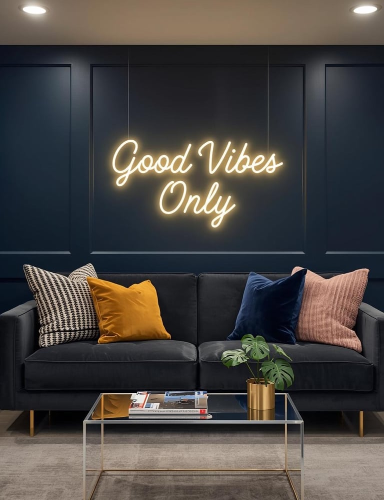 Ready to make a bold, playful statement? LED light art or custom neon signs bring modern edge and personality that literally glows. Choose motivational quotes, abstract shapes, or custom phrases that reflect your vibe—think "Good Vibes Only," geometric line designs, or even your family name in chic script. The soft ambient glow creates mood lighting that's equal parts functional and artistic, perfect for evening entertaining or cozy movie nights. This contemporary approach works beautifully in modern, eclectic, and maximalist spaces that aren't afraid to break traditional decor rules. It's Instagram-worthy impact that doubles as conversation-starting art with serious wow factor.