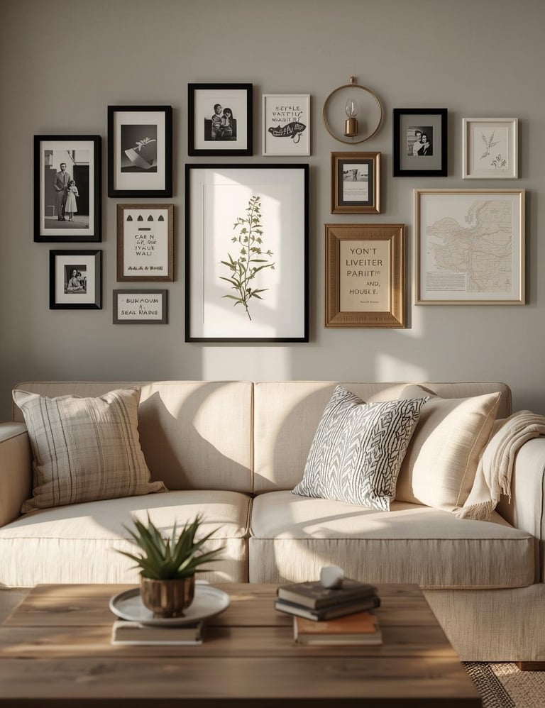 A gallery wall is where your personality gets to shine. Mix frame styles, sizes, and artwork to create a curated collection that tells your story—family photos, travel prints, vintage finds, and meaningful quotes all work together beautifully. The secret to nailing this look? Plan your layout on the floor first, keeping 2-3 inches between frames for breathing room. Start with your largest piece slightly off-center, then build around it. This approach works magic in eclectic, traditional, and farmhouse spaces where layered, collected-over-time vibes feel authentic. Don't stress about perfection—the slightly imperfect, lived-in look is what makes gallery walls feel genuinely yours.