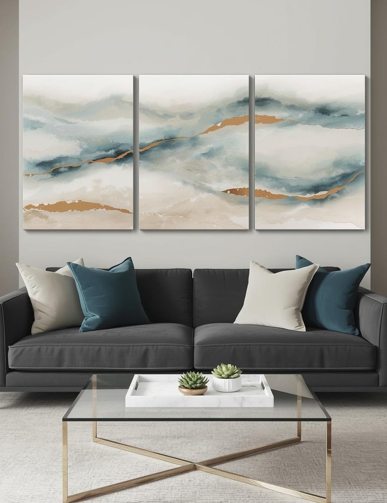 A triptych—three connected canvas panels—creates visual flow that guides the eye across your wall with effortless sophistication. This format works beautifully because it fills space without feeling heavy, offering movement and dimension that a single piece can't quite capture. Choose cohesive imagery that spans all three panels—think serene landscapes, abstract gradients, or botanical prints that tell a unified story. The key is maintaining consistent spacing between panels (typically 2-4 inches) for that polished, intentional look. Color coordination matters here: pull tones from your existing decor to create seamless harmony. Perfect for contemporary and transitional spaces that appreciate clean lines with artistic impact.