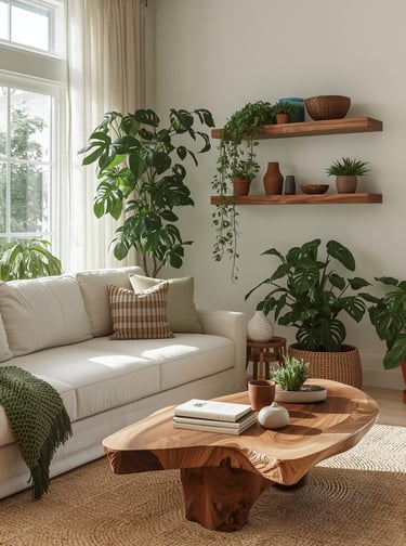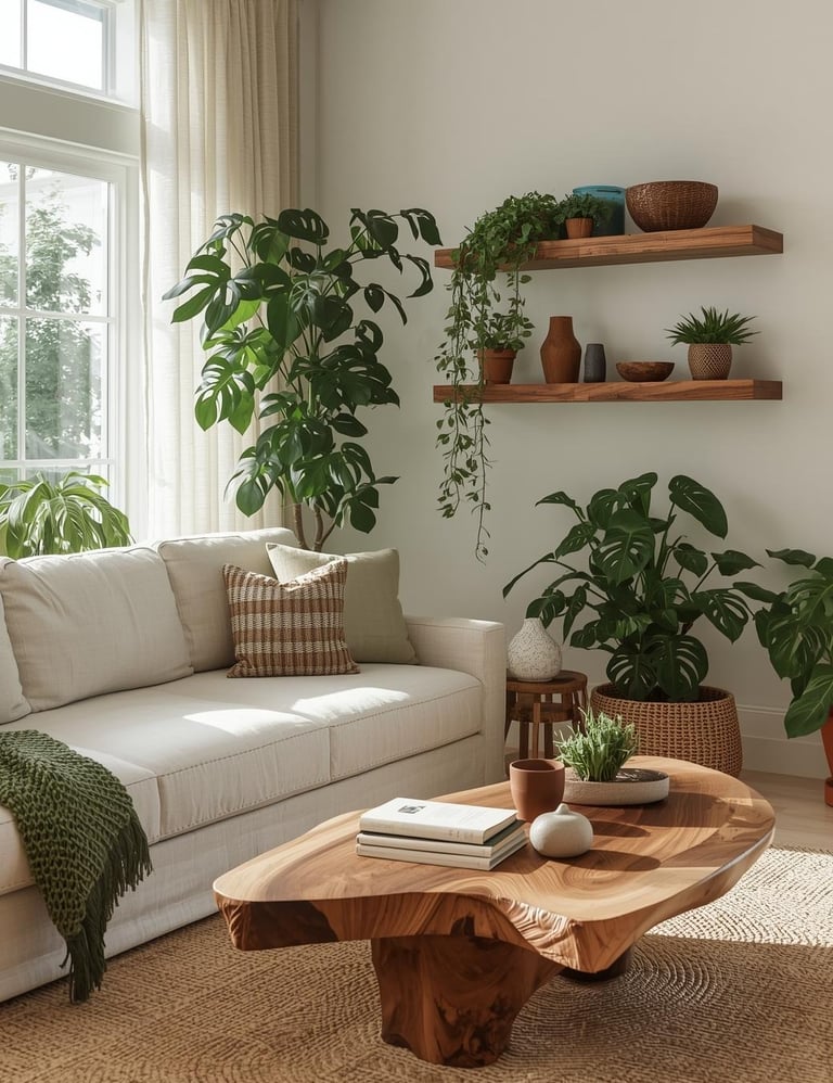 Connect with nature daily through biophilic design that prioritizes greenery, natural materials, and organic elements throughout your living space. Fill your room with abundant plants at varying heights—trailing, climbing, and standing varieties creating indoor jungle vibes. Incorporate natural materials everywhere: wood furniture, stone accents, linen textiles, and nature-inspired color palettes in earthy greens and browns. Maximize natural light through sheer curtains or bare windows. This wellness-focused approach improves air quality, boosts mental health, and creates visually calming spaces that feel alive. Perfect for anyone craving connection to the natural world without leaving home.