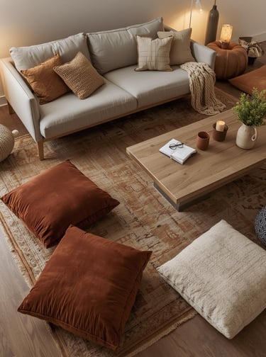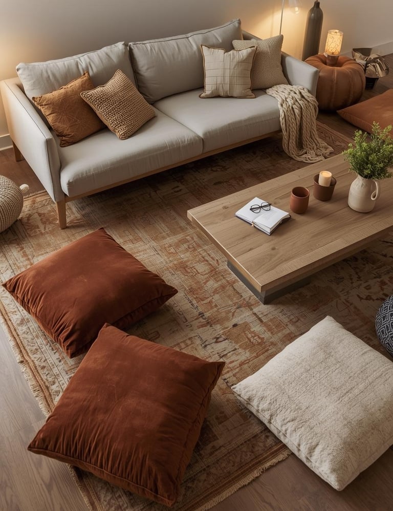 Ditch formal, stiff furniture for low-slung seating that prioritizes relaxed comfort over stuffy presentation. Platform sofas with low backs, oversized floor cushions, and Moroccan poufs create casual, lounge-forward spaces designed for actual lounging. This ground-level approach fosters intimate conversation areas where everyone feels equally relaxed—no hierarchy, just ease. For the truly committed, sunken conversation pits bring '70s nostalgia with modern execution. Relaxed, bohemian, and modern minimalist styles embrace this laid-back vibe beautifully. Your living room becomes the ultimate hangout spot where comfort always wins over formality.