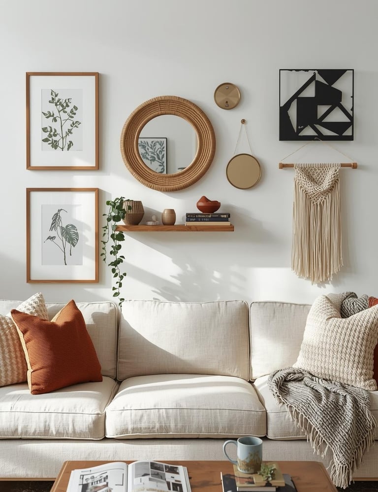 Flat frames are just the beginning—2026 gallery walls embrace dimension through mirrors, floating shelves, metal sculptures, and woven pieces creating shadow play and depth. Move beyond two-dimensional art by incorporating three-dimensional elements that literally pop off the wall. Mix framed prints with circular mirrors, add small floating shelves holding objects between frames, include metal wall art casting interesting shadows throughout the day. Arrange organically rather than rigid grids for collected authenticity. Modern, eclectic, and maximalist spaces thrive with this dimensional approach that transforms walls into living, evolving displays with serious visual impact and tactile interest.