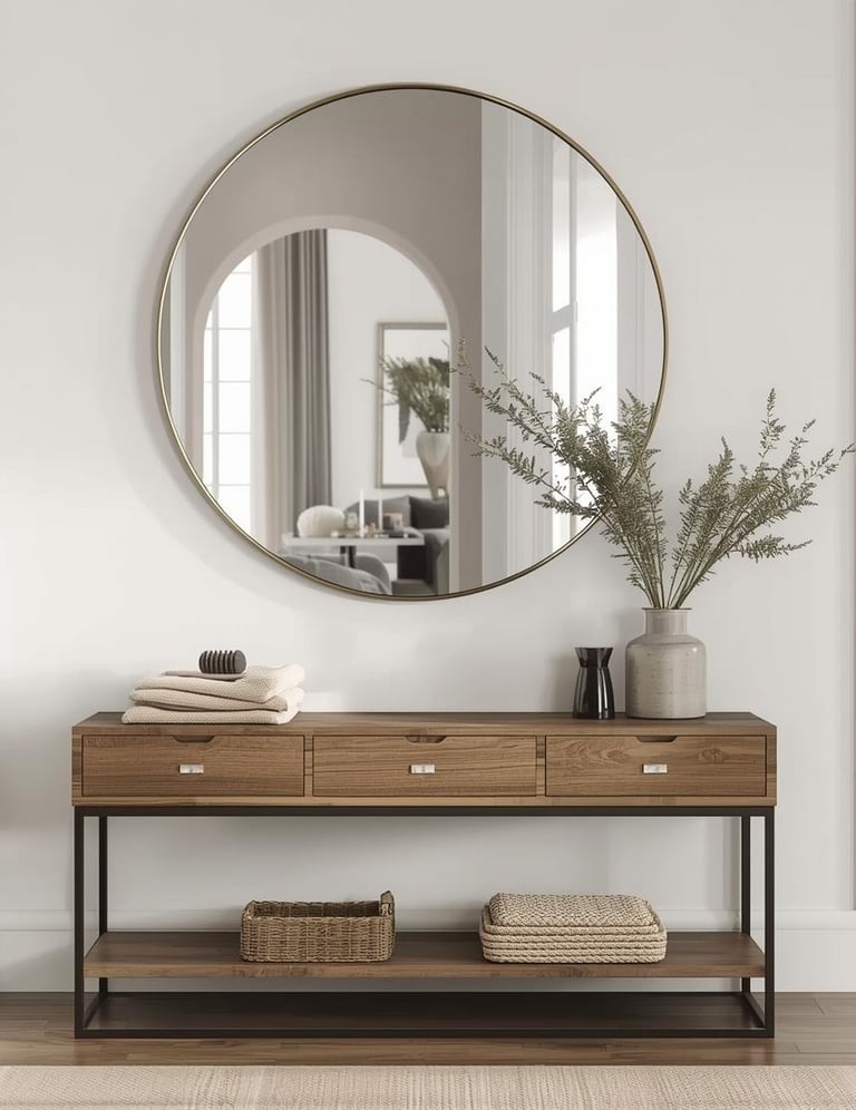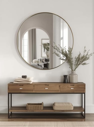 I hung a large round mirror with a thin brass frame above my console table, and it's become the focal point of my entryway. It didn't need anything else around it—no flanking sconces, no additional art, nothing. The mirror itself is the statement, and the simplicity of having just that one piece makes the space feel so much more intentional and calm.