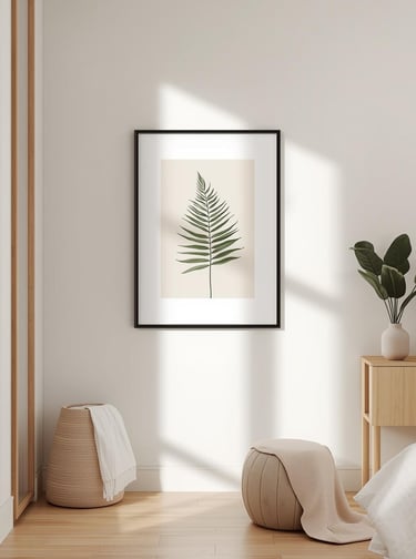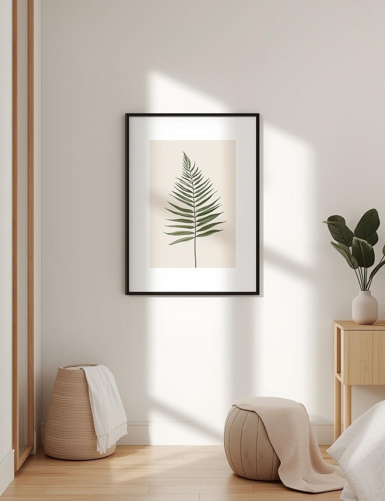 The key to botanical prints in minimalist spaces is choosing pieces with clean, simple compositions. A single leaf or stem on a plain background works beautifully. Avoid busy arrangements with multiple flowers or plants—the simpler, the better. Think one graceful palm frond, a single pressed fern, an elegant monstera leaf, or a minimal line drawing of a botanical element.