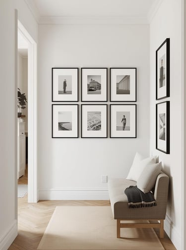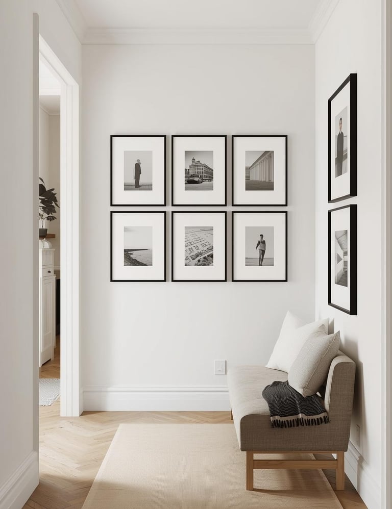 For a truly minimalist approach, choose one large black and white photograph in a simple frame, or create a small grid of matching frames with coordinating black and white images. The key is keeping it cohesive—same frame style, same mat size, similar subject matter or aesthetic. Maybe it's four architectural photos in a perfect square arrangement, or three landscape images in a horizontal row.