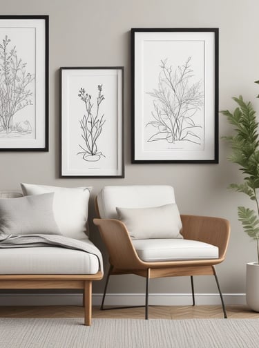 You can go super minimal with just one line art print in a simple black or natural wood frame, or create a small, curated collection of two or three complementary pieces. I have two line drawings in my bedroom—one is an abstract female figure, and the other is a simple botanical stem—and they're both in matching thin black frames. The simplicity is what makes them work so beautifully together.
