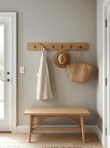 I installed a simple wooden peg rail in my entryway, and it's become one of my favorite features. I keep just three things hanging on it—my everyday jacket, a canvas tote, and a small wreath that changes seasonally. The simplicity makes it feel intentional and calm rather than cluttered, and it's so much prettier than a coat rack or hooks scattered randomly on the wall.