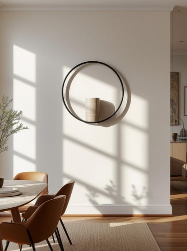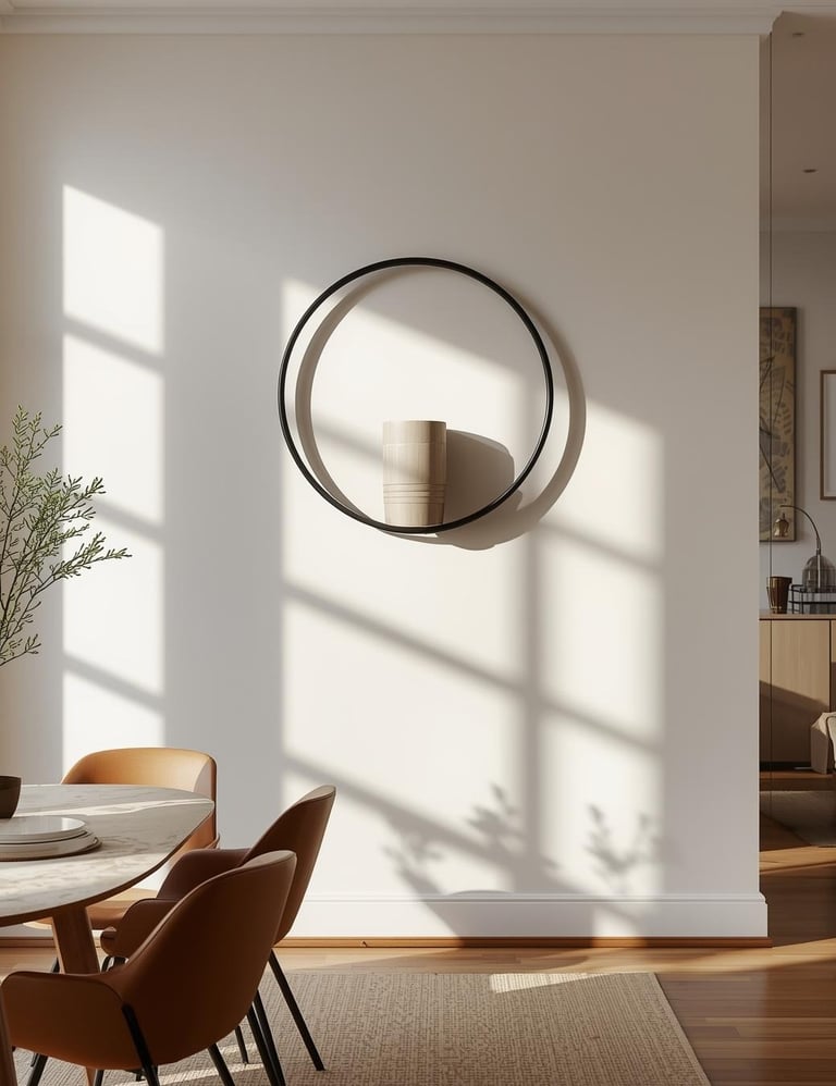 I have a modern metal circle sculpture on my dining room wall, and I love how the light creates different shadows throughout the day. It's dynamic and interesting without being busy or colorful. The sculptural element adds depth that flat art can't achieve, making the wall feel more alive and dimensional.
