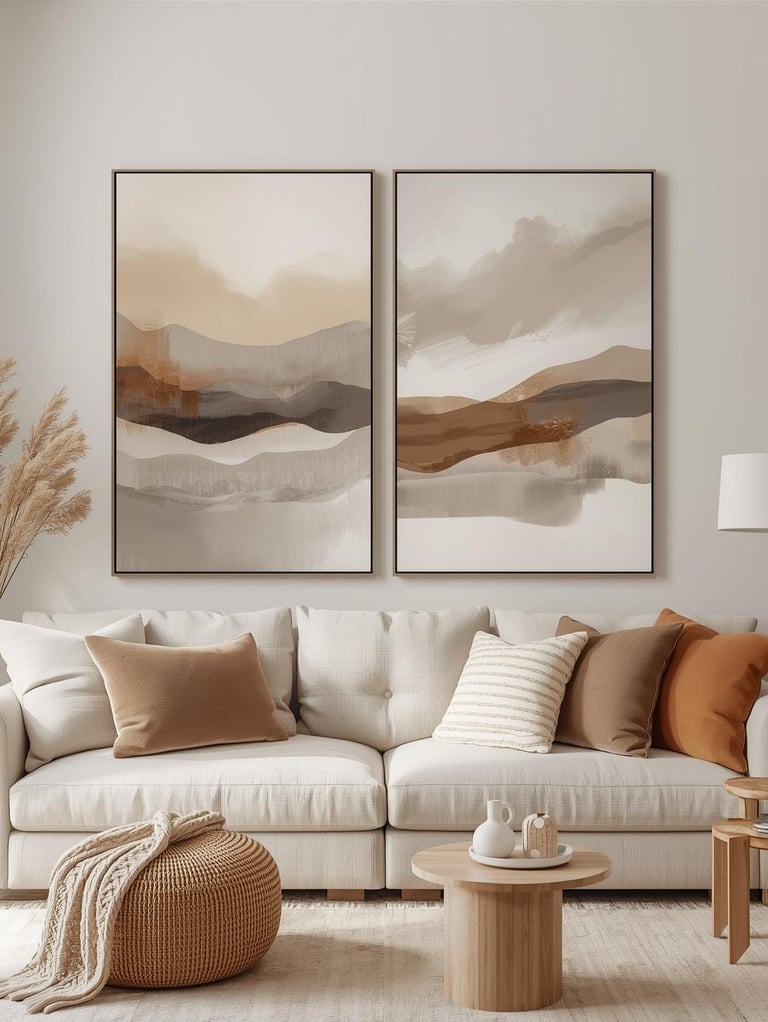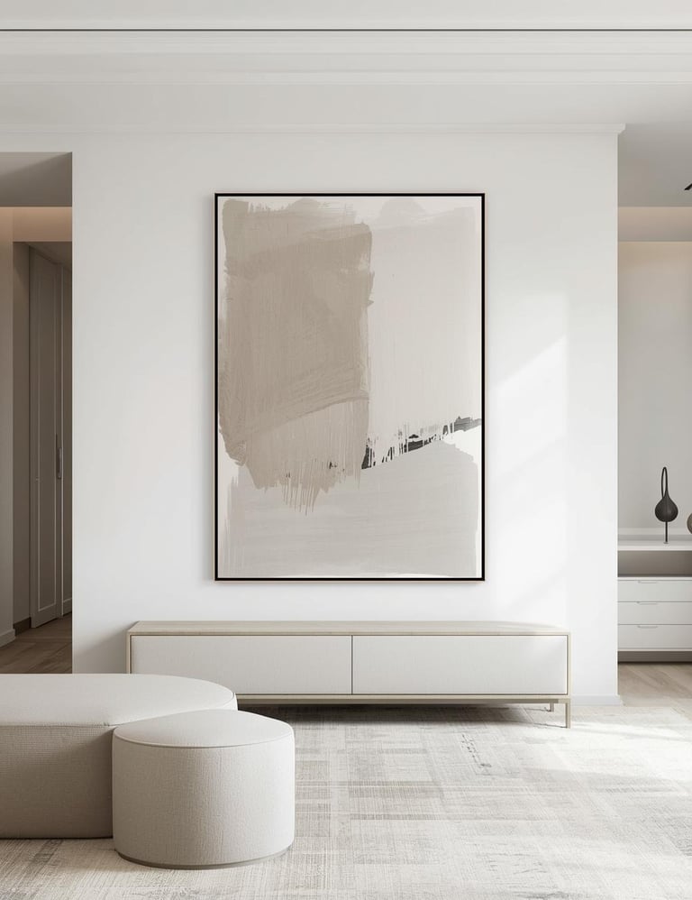 Try pairing two complementary neutral abstract pieces side by side for added impact, or let one large piece stand alone. Either way, the soft, muted palette keeps everything feeling calm and minimalist while still adding that essential touch of artistry to your walls.