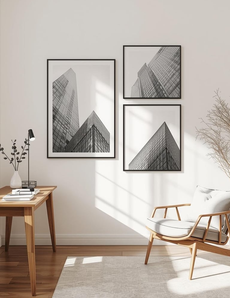 What I love about this type of wall art is how versatile it is. It can lean modern and sleek with photos of contemporary architecture, or feel vintage and nostalgic with old blueprints or historic building sketches. Either way, the structured, geometric nature of architectural imagery creates this sense of order and calm that's perfect for minimalist spaces.