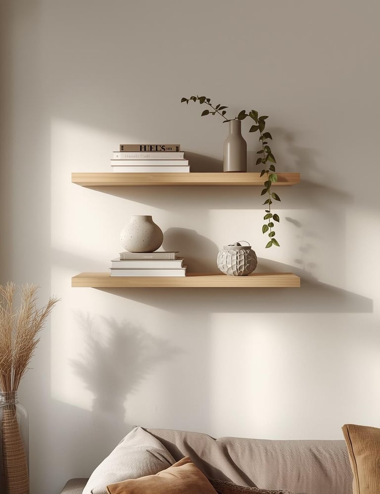 I installed two simple wooden floating shelves in my living room, and instead of loading them up with knickknacks, I kept it sparse: a small stack of my favorite books, one beautiful ceramic vase, and a tiny trailing plant. That's it. The simplicity makes each item feel more intentional and special, and the shelves add interest to my wall without creating visual clutter.