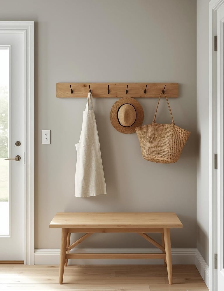 The key to keeping peg rails minimal is restraint in both the design and what you hang. Choose rails with clean lines—Shaker-style wooden pegs, simple modern metal hooks, or a streamlined wood rail with minimal hardware. Avoid overly ornate or busy designs. The rail itself should be simple and understated.