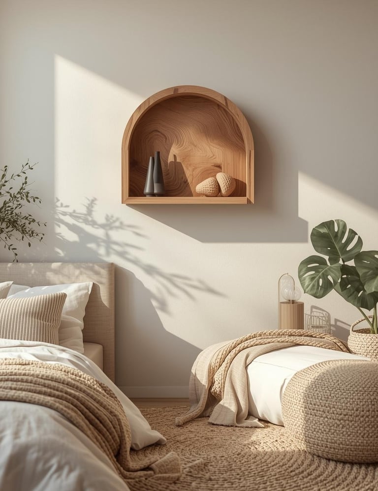 Natural wood pieces are such a beautiful way to add warmth and organic texture to minimalist walls without introducing visual clutter. Whether it's a simple wooden circle, an arched wooden shelf, or a carved geometric shape, wooden wall art brings that earthy, grounded element that makes minimalist spaces feel less sterile and more inviting.